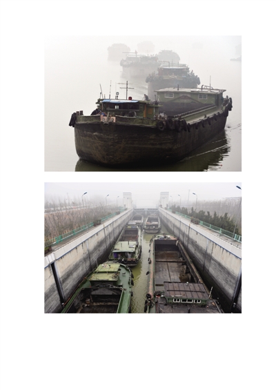 1月17日,京杭运河台儿庄段水面出现大雾,能见度不足50米,当地气象部门发布大雾橙色预警。市海事局对船舶实施临时交通管制,台儿庄船闸上下游段临时停航,至11时许,开始陆续有船舶过闸。 (高启民 摄)