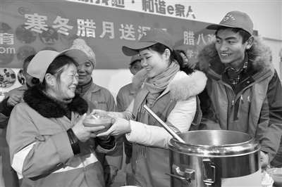 腊八节将至,安徽省合肥市瑶海区和平路街道组织志愿者为环卫工人送上热腾腾的腊八粥,让他们感受到寒冬里的温暖。