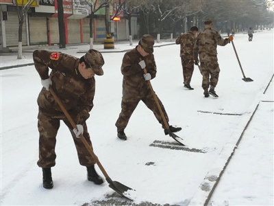 图③:1月28日,台儿庄区人武部组织机关干部职工和运河街道民兵清扫积雪。 (记者 岳娜 通讯员 孙中军 摄)