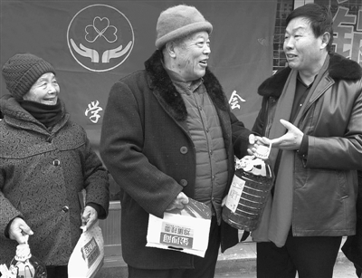 1月27日,滕州市学雷锋爱心协会到善国苑社区十里铺1、2、3、4村,为这里的123位80岁以上老人送上过年的米、面、食用油等物品。 (记者 张华 摄)