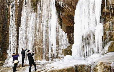1月28日,游人在山亭区一处塘坝前拍摄冰瀑。