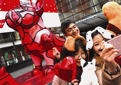 ➝1月29日,一些游客在上海街头和卡通狗艺术装置合影留念。