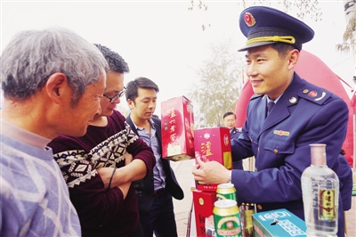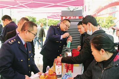 图②:山亭区工商执法人员在街头向消费者介绍真假白酒的辨别方法。 (张强 摄)