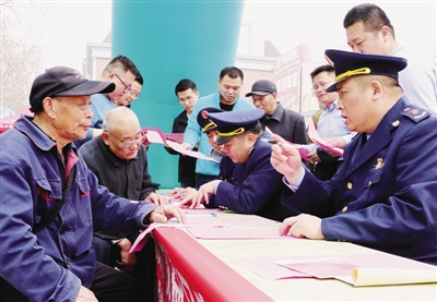 图③:市场监督管理部门执法人员在街头为消费者提供咨询服务。 (吉喆 摄)