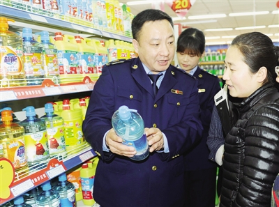 图④:峄城区市场监督管理局的工作人员在一家超市为市民讲解辨别商品真假的方法。 (孙启路 杨云芳 摄)