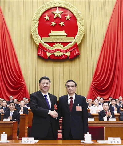 在主持人宣布李克强同志为中华人民共和国国务院总理后,全场响起热烈的掌声,李克强起身向代表们鞠躬致意。他转向习近平,两人亲切握手,习近平向他表示祝贺。