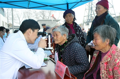 近日,台儿庄区泥沟镇政府邀请医务专家到大北洛等村开展“义诊进村入户 关爱老人健康”活动,为65岁以上老年人进行健康检查。图为专家在给患者义诊。 (记者 岳娜 通讯员 刘凤琦 摄)