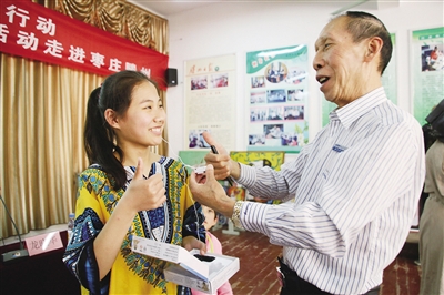 3月28日,滕州市特殊教育学校举行了2018省侨联“启喑”行动暨“魏基成天籁列车”助听器捐赠活动走进滕州仪式。从澳大利亚来的华侨义工黄兆邦先生受魏基成夫妇嘱托,再次来到滕州为特殊教育学校,为听力残障儿童捐赠了90台最先进的蓝牙耳机助听器,以及世界限量的蓝牙语音教学机和一些衣服。黄老先生为听障儿童戴上助听器,当孩子们听到声音时,她们的脸上洋溢起幸福的笑容,感受到社会大家庭的温暖。 (记者 侯志龙 实习记者 张华莉 摄)