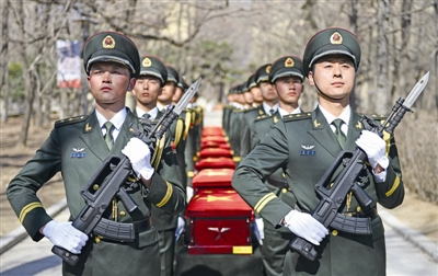3月29日,礼兵在安葬仪式上护送志愿军烈士遗骸棺椁。