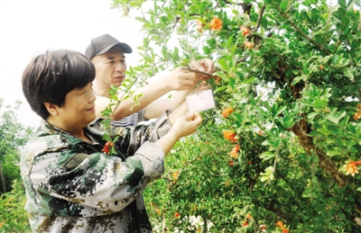 当前,石榴花即将进入盛花期。连日来,峄城区及时启动石榴花期气象服务,气象专家和当地“田秀才”会商,预测石榴盛花期时间,为指导榴农管理和游客赏花提供科学依据。图为气象技术人员正在石榴园进行花期调查。 (孙启路 摄)