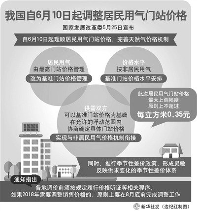 国家发展改革委25日宣布,自6月10日起理顺居民用气门站价格、完善价格机制。这是我国自2010年以来首次调整居民用气门站价格,最大上调幅度原则上不超过每立方米0.35元。
