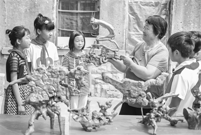 6月8日,山亭区宝山福彩小学将课堂搬进非遗传承人张培华的家庭根艺馆,让学生们欣赏根艺作品,零距离感悟根艺魅力。图为:张培华向学生介绍根艺作品创作过程。 (孙晋猛 王绍英 摄)