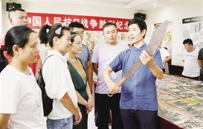 图为民间收藏爱好者(右一)向参观者展示抗日英雄使用的大刀。 (吉喆 耿德刚 摄)