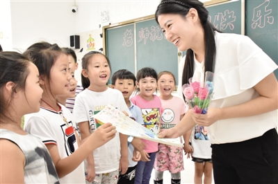 左图:市实验小学二年级学生将自己制作的手抄报送给老师。 (胡乐彪 摄)