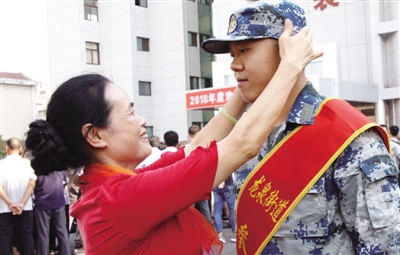 上图:9月10日,滕州市欢送新兵入伍大会上,身着大红喜庆衣服的母亲为儿子整理衣帽。