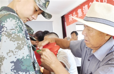 下图:9月11日,台儿庄区涧头集镇欢送新兵入伍仪式上,孙楼村70岁老人孙发伦给孙子戴上光荣花。