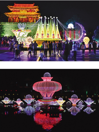 左图:9月23日晚,游人在古城游玩赏灯。 (高启民 摄)
