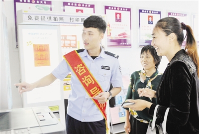 今年以来,山亭公安分局健全完善窗口服务措施,全区户籍和出入境窗口实现了“马上办”“一次办”目标。截至目前,一次办好户口登记、变更、迁移及出入境签注等13600余项,赢得社会各界的好评。图为综合服务大厅咨询导办员热情为群众服务。 (张雷 郝怀宝 摄)