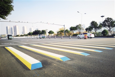 连日来,薛城区对8条主干道42个路口和9个学校通道进行立体斑马线施划工程。这种立体斑马线由蓝、白、黄三种颜色组成,涂料中还添加了玻璃粉,即便晚上也清晰可见。 (刘品 王婧 摄)