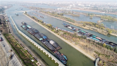 →11月23日,满载电煤的船舶正在通过京杭运河台儿庄船闸。