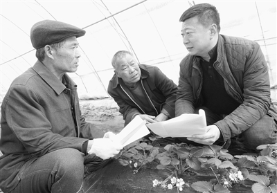 →近日,受强冷空气持续影响,我市出现大风和降温天气。烟台大学派驻山亭区店子镇店子村第一书记赵显伟,将当地气象部门发布的寒潮预报和大棚果蔬防寒技术措施打印成明白纸,发放到大棚草莓种植户手中。图为12月10日,赵显伟(右一)为草莓种植户讲解应对寒潮措施。 (李宗宪 王鹏 摄)