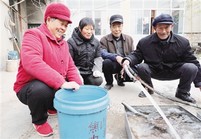今年以来,山亭区凫城镇政府先后投资80余万元,为焦山、山湾自然村修建蓄水池、村内主管道等户户通自来水升级惠民工程,老旧管道升级改造后,村民们每天都能喝上清澈的自来水。图为12月25日,焦山村村民在接自来水。