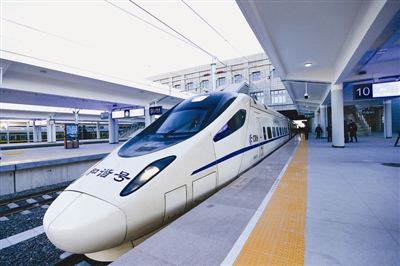 新通高铁从通辽到沈阳的首列动车组列车停靠在通辽站准备发车(12月29日摄)。