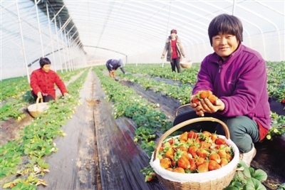 棚外正是滴水成冰的寒冬,棚内熟得透红的草莓果,给寒冷的冬天带来了生机,给新年的城乡市场和人们的生活增添了吉祥与活力。