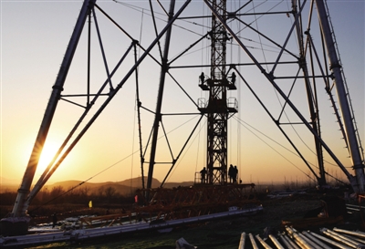 图为:在山东——河北1000千伏特高压交流环网线路工程枣庄段施工现场,建设工人们冒着严寒进行铁塔组立。