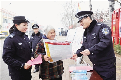 1月15日,市公安局山亭分局组织民警开展“利剑安民2019”主题法治宣传活动,向过往群众宣传法律法规和各类安全防范知识,为他们送上一份“平安年礼”。图为:民警向群众宣讲冬季安全防范常识。