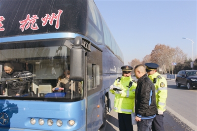 1月21日,市交通运输监察支队在全市范围内开展代号为“平安2019”的道路运输市场秩序专项整治行动,严厉打击“两客一危”等道路运输违法行为,保障春运安全。图为执法人员正在检查过往车辆。 (记者 孙秋实 摄)