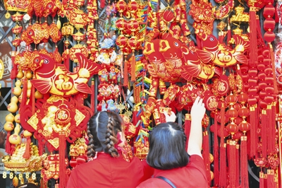 1月28日,在泰国曼谷,顾客在唐人街的摊位上选购春节饰品。