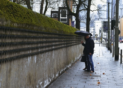 1月27日,在德国法兰克福,人们在老犹太公墓外驻足。老犹太公墓286米长的外墙被称为“姓名墙”,上面镶有超过1万个小金属盒。金属盒上镌刻着1933年至1945年期间被驱逐和杀害的犹太人档案。