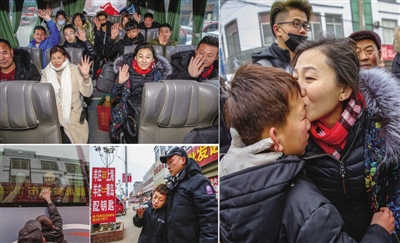 满含眼泪的赵海霞带着深深的不舍与儿子吻别。在大巴上看着父子两人,赵海霞强忍着泪水露出了会心的笑容,拿起手机又与儿子说着悄悄话。