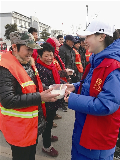 活动中,枣庄奚仲志愿者协会在关爱一线环卫工人的同时,更注重为中学生们创造社会实践的机会。来到环卫工人们的集合地点,穿着红马甲的中学生志愿者们有的还一脸青涩,不知该做些什么,在志愿者协会工作人员的指导下,他们开始整理餐盒盛元宵,然后把热气腾腾的元宵一碗一碗地端到环卫工人手中。环卫工人接过元宵不停地感谢;一位环卫工人把元宵放进嘴里,大口地吃着:“孩子们送的元宵更好吃。”环卫工人们吃着元宵,接过孩子们送来的毛巾和手套,笑得非常开心。