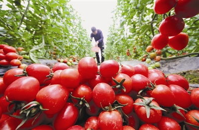图为:2月19日,市中农民在精品特色园大棚里采摘西红柿。
