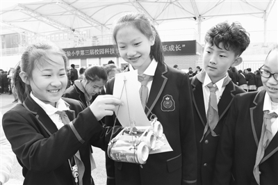 3月28日,市实验小学举办了第三届校园科技节活动。孩子们利用废旧材料做成的一件件小发明和小制作吸引了众人的眼球。图为一名学生向同学展示自己的作品。