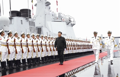 习近平向各国官兵挥手致意。各国海军代表团团长在检阅舰后甲板就座观礼。