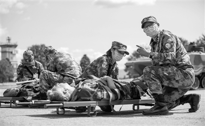 7月9日,在德国费尔德基兴卫勤训练基地,中方卫勤分队队员在演习中对“伤员”进行检伤分类。