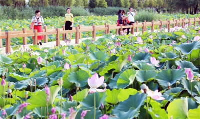 图为7月6日,游客在湿地公园赏荷。