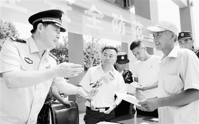 连日来,山亭区公安分局治安大队组织民警走上街头、社区向群众宣讲安全防范常识,提高群众安全防范意识和技能。图为民警向群众发放防火防盗防诈骗防意外事故的“明白纸”。