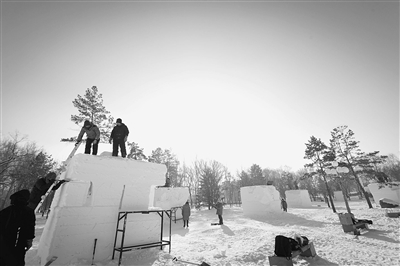 1月3日,参赛选手在太阳岛雪博会园区内制作雪雕。