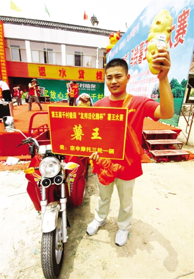 6月29日,在滕州市界河镇西杨庄蔬菜市场一农民展示自己种的土豆。当日,第五届中国(滕州)马铃薯节,千村植保“友邦活化酶杯”薯王大赛在界河镇西杨庄蔬菜市场举行。这次薯王大赛有1726人参赛,来自10多个乡镇种植土豆的农民,在激烈的角逐后,滕州市滨湖镇西洋汶村的80后小伙孙明勇获得“薯王”称号,他种植的单个土豆达3.27斤。