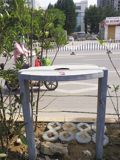 昨日,记者途经文化路看到,路边一垃圾箱只剩下空空的框架,盛垃圾的筐子没了踪影,市民只好把废纸扔在箱顶上。