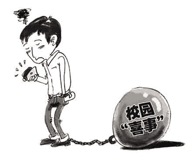 不仅如此,同学之间过生日,考上研究生,得了奖学金等等均成了请客吃饭的一个理由。“最害怕的就是遇上节日。”音乐专业的小李称,现在的女生简直就是逢节必过,情人节、三八妇女节、五四青年节、圣诞节……甚至连属于小朋友的儿童节也不放过。每过一个节日,男生就要“大出血”一次。“没有办法,为了讨女朋友欢心,只能奉陪到底。”小李表示。“大学校园的人情消费,已经成了我们无法摆脱的沉重负担。”采访中,数位大学生表达了他们的无奈。