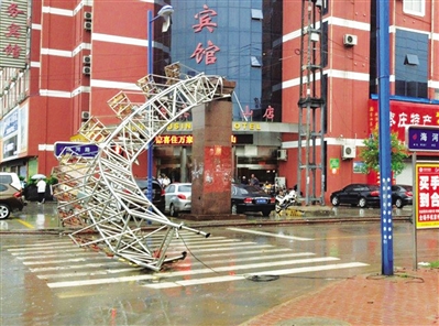 2日早晨7时许,薛城区泰山路与海河路西侧路口,一标有“四季春市场”的铝合金架被当日凌晨光顾枣城的阵风刮倒,堵了马路,阻碍了来往车辆的正常通行,为避开此路障,行至此处的车辆纷纷绕行。 (特约记者 寇光 摄)