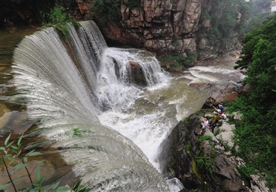 近日,山亭区连降暴雨,丰沛的雨水使群山中形成众多的山泉瀑布,吸引许多市民前来观光游玩、戏水避暑。 (特约记者 李宗宪 摄)