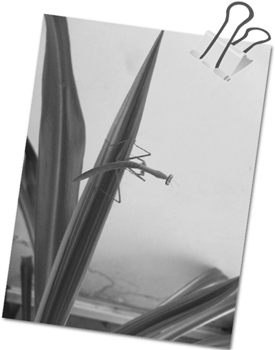 近日,在市电视台工作的吴先生在办公室里养的吊篮上发现了一只小螳螂。通体翠绿的小螳螂趴在碧绿的吊兰叶子上,不仔细看还真发现不了。吴先生说:“虽然螳螂不算少见,但在办公室也很少能见到。同事们都很喜欢这只小螳螂,大家决定将它当做宠物。” (特约记者 张潇艺 摄)