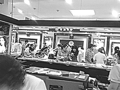 一组柜台,四五名营业员,一对一接待顾客,这是黄金专柜最常见的景象。“黄金又降价了!才305元/克。”记者一进入商场,就听见不少市民议论纷纷,奔走相告。7日,市中区解放路某大型商场黄金专柜前,前来选购黄金饰品的人围了四五层,四五名营业员都忙不过来。