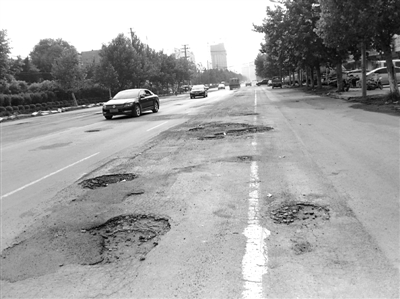 继续前行,每隔几米就能见到路面上出现大坑,大多数的坑洼已经形成坑连坑,小一点的直径有20厘米,而大一点坑洼都能占据三分之一路面。记者细数了一下,从华山路口一直到西外环,大小坑洼加起来多达40处,而且很多坑洼地方都是在原有修补好的路面上又再次出现的。